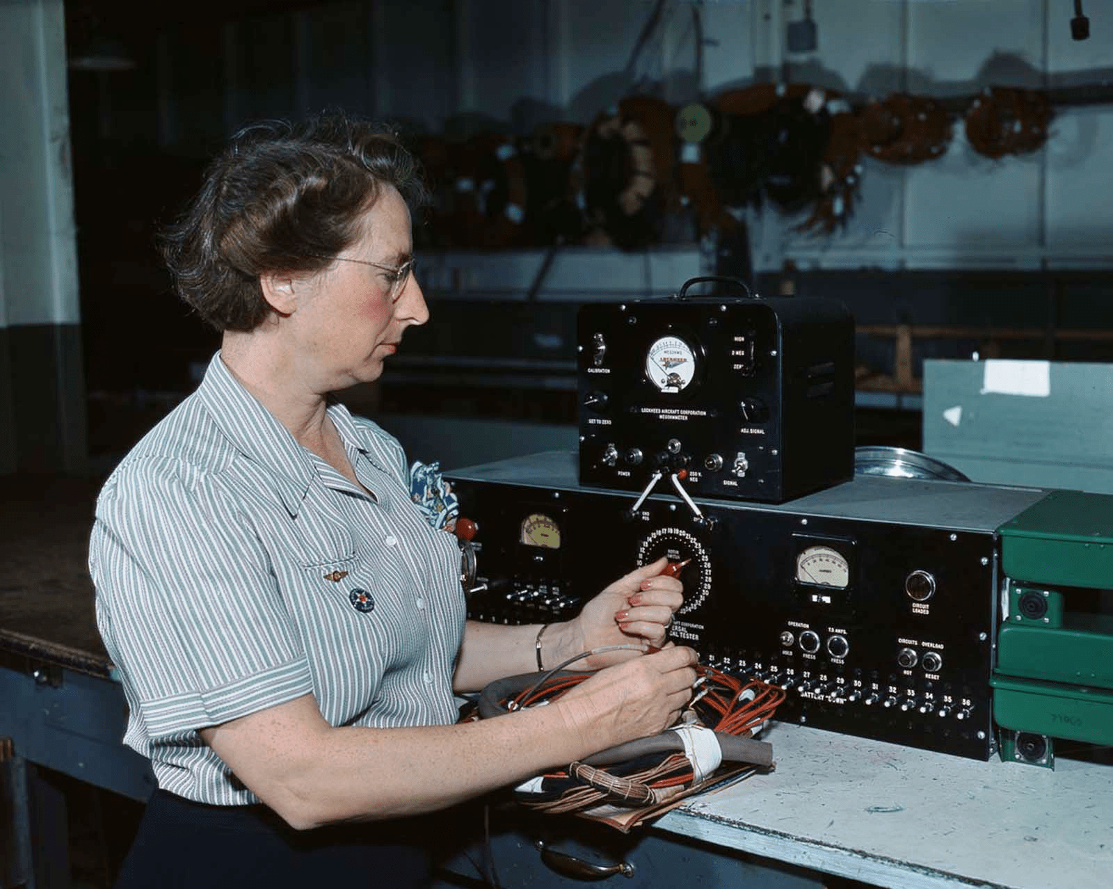 An employee of Douglas Aircraft Company works with electrical wiring at the plant in Long Beach, California. 1942. – Source Rare Historical Photos